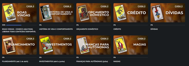 É uma mentoria coletiva com aulas, plantões ao vivo, comunidade, magias e afins sobre orçamentos, planejamento, dívidas, investimentos, crédito, história de vida e comportamento, além de outros temas.